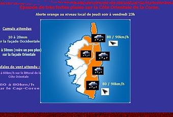Une dégradation avec des pluies assez soutenues concerne la Corse depuis cette nuit. Venue de Sardaigne, ces pluies ont débutées par le Sud-Est de l'île, et se sont se généralisé à toute la partie Est. Un vent d'Est à Sud-Est souffle également assez fort en accompagnant ces pluies. Le Centre de la Corse et la Côte Orientale, seront les endroits les plus exposés par ces fortes pluies. La façade Occidentale étant plus à l'écart, mais pas épargné cependant... Notre rédaction a donc émis une alerte orange au niveau local pour cette dégradation. Cette alerte a prit effet hier soir à 21h, jusqu'à ce soir 23h. Voici notre bulletin de vigilance