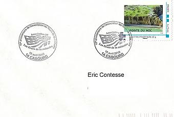 Le timbre personnalisé ci-dessus (tarif permanent prioritaire pour lettre de moins de 20g envoyée en France) représente une vue aérienne de la Pointe du Hoc, située entre les plages de Utah Beach et de Omaha Beach, deux hauts lieux du débarquement allié le 6 juin 1944.Une partie des terrains de la Pointe du Hoc a été léguée par la France aux États-Unis en 1979 et un monument rend hommage au sacrifice des troupes américaines.