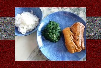Vendredi soir, un dîner à trois composantes fort agréable, d'inspiration légèrement japonaise : saumon laqué à l'orange, épinards au sésame, riz. Le saumon (une recette vue dans un magazine de cuisine) avait mariné dans un mélange de jus d'orange et sauce soja avec du shichimi (un mélange d'épice traditionnel japonais un peu pimenté). Il il était délicieux, parfumé et moelleux. Un repas finalement assez vite prêt car tout cuit en même temps. Il faut juste être là à l'avance car le saumon doit mariner 1h30-2h avant cuisson.