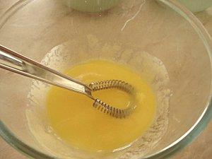 Mélangez le sucre et la farine + l’œuf entier et quelques cuillères de lait froid.