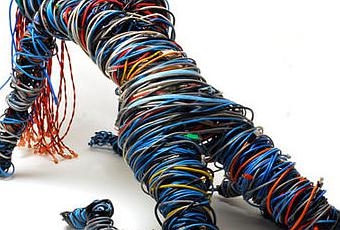 Voici un autoportrait de l'artiste Kasey McMahon baptisé Connected, essentiellement composé de cables ethernets, de cables électriques et d'acier. Kasey est fascinée par la complexité qui existe dans et entre les royaumes naturels et technologiques... et voici l'un des résultats de cette pensée.