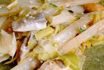 Recettes des blettes hareng et cacahuètes: retirer les feuilles vertes, effiler les parties blanches. Couper les tiges en lanières, en profiter pour enlever le reste de fibres. Donner couleur à un oignon coupé en morceaux dans une poêle puis ajouter les tiges de blettes avec un peu de gros sel. Couvrir, ajuter un peu si besoin. Une fois cuites (environ 20-25 min), ajouter les filets de harengs coupés en morceaux, la fondue de poireaux avec cachuètes et graines de sésame. Mélanger.