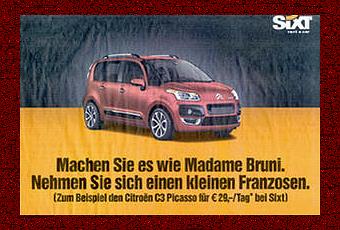 Problème : " comment ramener ce trop plein de voitures en Allemagne vers la France ? Sixt a donc imaginé une publicité humoristique, se servant du nom de Carla Bruni. "Faites comme madame Bruni, prenez un petit modèle Français", indique ainsi l’affiche, faisant référence aux voitures françaises… ou à la taille du président souvent raillée par les humoristes "