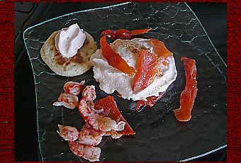 mSur chaque assiette, disposer un blinis avec une noix de Chantilly dessus, un dôme de Chantilly à la tomate (mettre un peu de paprika dessus), et les lamelles de saumon autour