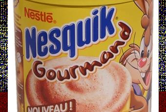 - Nesquik Gourmand a 0.5 % de cacao maigre en plus. Il contient du lait écrémé en poudre, du sirop de glucose déshydraté, du lactose, de l’huile végétale hydrogénée, du filtrat de petit lait, des protéines de lait et de la vanilline.
