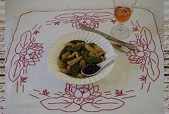 * Ajouter alors les pois gourmands, le sucre, le bouillon, la sauce de soja et le vin rosé.
