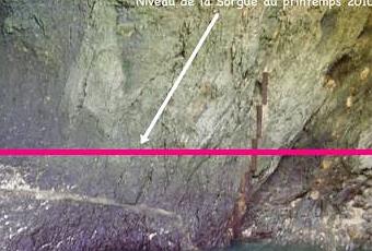 L’image d’une Provence sèche, où chaque homme n’a de cesse de chercher une source et de ne rien en dire, façon Manon des Sources, est parfois battue en brèche. Il y a ainsi, entre Fontaine-de-Vaucluse et les abords de l’Ouvèze, une rivière un peu branque, limite hystérique au printemps, qui coule abondamment et un peu en tous sens, à la température quasi constante de 13 ou 14°C (degrés qui, dans cette région proche de Chateauneuf-du-Pape, désignent plus souvent une teneur alcoolique qu’une température). Cette foldingue qui jaillit de la montagne s’appelle La Sorgue, et elle fait le bonheur de la commune charmante de Fontaine-de-Vaucluse, qui peut ainsi, surfant sur la vague du tourisme de masse, amasser des pépettes en vendant à prix d’or des provençaleries made in China (ou pas). Que viennent voir nos touristes ? la résurgence de ladite Sorgue, résurgence mais pas “source”, bien trop difficile d’accès même pour des spéléologues aguerris ! Une rue piétonne monte ainsi doucement vers une extraordinaire falaise, bordée à droite par une Sorgue tantôt couleur menthe à l’eau tantôt couleur piscine, à gauche par l’alignement des étals des marchands du temple, façon grimpette au Mont-Saint-Michel (sauf que sur les bords de la Sorgue, on ne peut quand même pas acheter une tour eiffel en porte-clé, alors qu’au Mont-Saint-Michel, si !). Au bout de la piste, une mare : cette mare c’est la Sorgue, sage comme une image. En apparence. Selon les saisons, elle est plus ou moins haute. A gauche, la Sorgue en été, à droite la même au printemps :