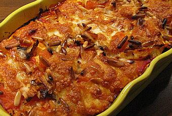 Couper des rondelles dans la mozarella et les déposer sur le dessus. Parsemer de pignons de pin et enfourner pour 30 minutes à 200°C