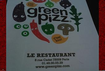 Début mars (le 03/03/2010, plus exactement), après une visite d’appartement rue de Paradis, je cherche un endroit où manger assez rapidement. Je m’arrête devant Green Pizz dont le nom m’amuse, hop, j’entre et je décide de tester. Ce n’est pas bien grand, plus profond que large. Au fond, un comptoir derrière lequel la cuisine/four et la caisse. À midi, on se sert, on commande sa pizza, on paie, on prend ses couverts (bambou disponible) et on va s’asseoir, soit à une des petites tables, soit sur un tabouret haut, face au mur.