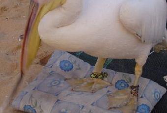 Aujourd’hui apprivoisé, le pélican solitaire a oublié les disgracieux filets et arbore fièrement des anneaux de perles en guise d'amulettes de protection.