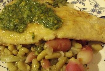Lieu sur lit de salade chaude et sa vinaigrette:2 filets de lieu