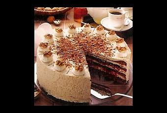 - Faire 4 disque dans le gâteau. Garnir 3 disques des cassis, puis les enduire de crème. Reconstituer le gâteau. L'enduire de crème et garnir de choux de crème surmontés de cerneaux de noix. Saupoudrer de copeaux de chocolat.