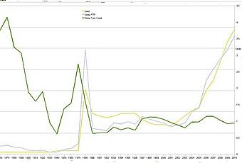 Nous sommes clairement sur des plus hauts historiques dont le précédent record remontait aux années 1980, fin de la "crise" 1971 - 1980, qui correspondait en fait à la fin de l'étalon-or, et à la libération de la monnaie de toute valeur de référence, et à son nouveau mode d'émission par le système centralisé (genre Minitel 1.0, très loin d'internet P2P) à réserves fractionnaires.