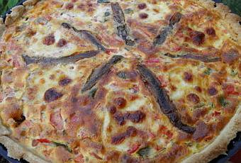 Verser la préparation dans le moule, et disposer des rondelles de mozarella en rond en alternance avec des filets d'anchois.
