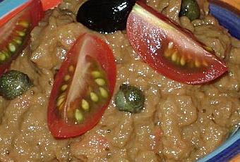 Couper la tomate et l'aubergine en cubes. Les mixer dans le robot avec l'huile d'olives afin d'obtenir une purée fine homogène.