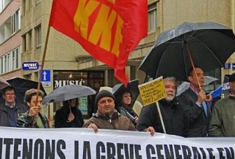 C’est parce que la situation en Grèce est inquiétante, c’est parce que les nouvelles qui nous parviennent sont alarmantes, c’est parce qu’il y a urgence que plusieurs organisations genevoises de gauche ont mis sur pied une manifestation organisée ce mercredi 5 mai devant la Mission grecque aux Pâquis. Une cinquantaine de personnes ont pris part à ce rassemblement malgré un froid persistant et une légère pluie. Le nombre faible des participants incombe aux organisateurs qui n’ont pas eu le temps nécessaire pour organiser ce rassemblement. Décidée seulement hier cette manifestation qui a voulu donner un échos à la grève générale d’aujourd’hui en Grèce n’a pas mobilisé la foule faute d’une communication à la hauteur de l’événement.