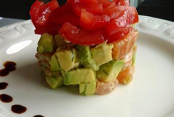 Ensuite, sortez vos deux bols du réfrigérateur. Disposez sur chaque assiette un cercle en inox. Remplissez de saumon avocat. Tassez. Versez quelques cubes de tomates.