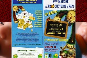 Le 1er festival d'art folklorique aura lieu samedi 24 avril sur la place Carnot à Lyon II (métro et tramway : gare Perrache). Au cours de l'après midi, plusieurs groupes folkloriques se produiront sur le marché : ardéchois, dauphinois, breton, limousin, le Groupe auvergnat Gergovia et des joueurs de quilles de l'Aveyron vous feront découvrir ou redécouvrir leur héritage culturel..