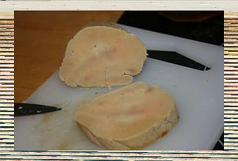 6 tranches de foie gras cru ("cuit" au sel et poivre selon méthode Mercotte) recoupées ensuite en 2