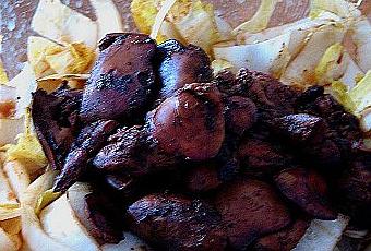 Emincer l'endive et la mettre dans un saladier. Assaisonner avec la vinaigrette puis verser les foies de volaille avec le jus. Déguster aussitôt.