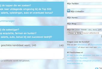 Sur www.twilliciteer.nl, les candidats peuvent se proposer pour un nouvel emploi via un tweet. A l’instar de la procédure de candidature habituelle, les chercheurs d’emploi doivent se vendre aussi bien que possible, à la restriction près qu’ils ne peuvent utiliser que les fameux 140 caractères pour réussir leur opération de séduction en vue d’envoyer leur CV. L’initiateur de twilliciteer.nl est Neomax, société d’intérim IT, qui surfe ainsi sur la tendance actuelle qui veut que le processus d’embauche se déroule toujours plus souvent via les médias sociaux.