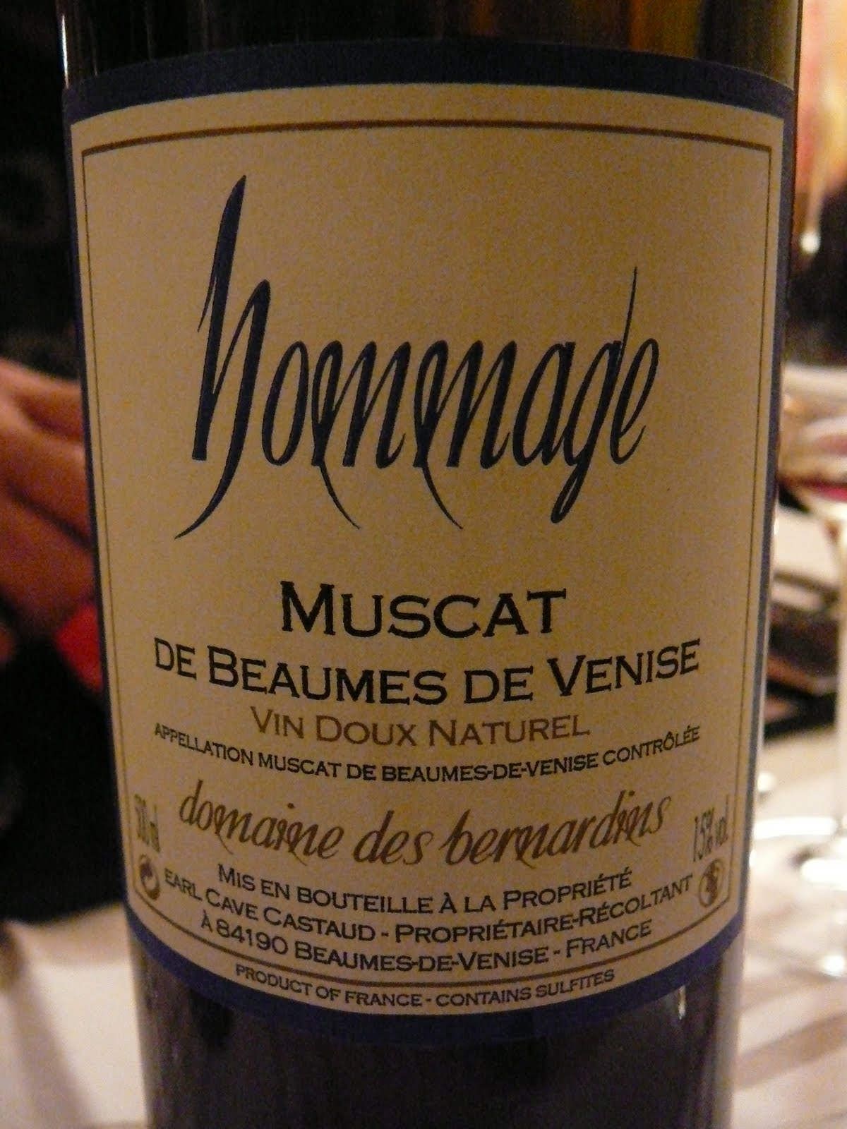 Muscat de Beaumes de Venise, cuvée Hommage (non millésimée), domaine des Bernardins (il s'agit là d'une cuvée spécifique mélangeant plusieurs millésimes et élévé sous un mode semi-oxydatif - A boire assez rapidement) : Une synthèse presque parfaite entre le côté explosif « typique » de l'appellation, sur la rose et la ronce, légèrement muscaté, et la force tranquille des Porto tawny, sur les pruneaux cuits, le tout étant associé un léger rancio très sapide. Sucrosité mesurée, bien équilibrée par une acidité indécelable mais certainement présente. Aucune molesse dans ce vin. Un accord d'anthologie (presque !) avec un tiramisu aux fruits rouges (maison)Bruno