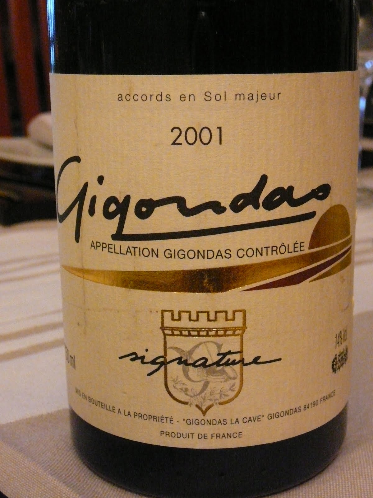 Gigondas, cuvée Signature 2001, La Cave de Gigondas : Beau compromis entre la structure méridionale, le fondu de l'age et la finesse du cru. J'aime beaucoup cette garrigue fumée, presque sur le romarin, ces petits fruits noirs et ces tannins déjà bien polis. Une pointe de sucrosité agréable. A l'instar de la cuvée « Chablis Vieilles Vignes »de la Chablisienne, cette cuvée « Signature » constitue toujours une excellente approche des vins de GigondasPécharmant, cuvée Prestige 2004, domaine du Haut-Pécharmant : un vin un peu en retrait par rapport aux précédents, marqué par son millésime. Malgré une belle constitution et des tannins fins, le côté gentiane / géranium me dérange un peu. J'ai mieux gouté d'autres millésimes de la propriété