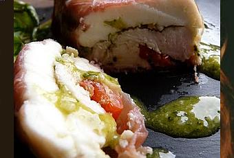 Tapissez des empreintes souples de jambon cru en le laissant dépasser . Alternez la mozzarella ; pesto , poulet , tomates. Renouvelez pour une 2eme couche repliez le jambon sur la garniture , tassez . Posez une planchette munie de poids et placez au frais 24 heures .