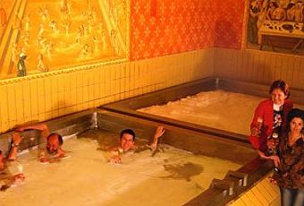 La bière serait reconnue comme bienfaisante pour la douceur de la peau et pour soulager les tensions nerveuses. Bizarrement on ne retrouve que ces messieurs dans le bassin, pendant que les femmes attendent à côté... Cliché ?