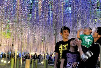 Le 8 mai, au Japon, à Ushijima dans le parc floral Ashikaga, cette famille prend plaisir à admirer une glycine estimée à 140 ans. NEWSCOM/SIPA