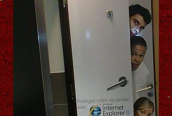 Microsoft met le paquet en ce moment sur ses produits maisons. C’est cette fois-ci sur le thème de la sécurité/vie privée que l’accent est mis, et plus particulièrement sur IE8 : campagnes TV, voitures aux couleurs du navigateur internet, affichages…Vous allez voir du Internet Explorer partout en mai, y compris dans les toilettes de plus de 200 établissements situés en Île-de-France !