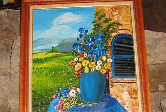 Doriane a tout fait : les tableaux évidemment ,l’accrochage des tableaux, les affiches mises partout dans le village , les flèches indiquant comment venir jusqu’à l’Expo ,les plats salés et sucrés , les bouquets de fleurs en différents endroits de la salle…Si j’énumère tout cela , c’est pour bien montrer tout ce qu’a fait Doriane. SEULE! Bravo ! Son mari et un ami l’ont aidée à déboucher les bouteilles et à servir. Bref , tout était parfait , Doriane. Ces quelques photos vous donneront la preuve d’une belle soirée dédiée à l’art et à l’amitié.