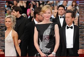La belle Cate Blanchett a monté les marches du Palais des Festivals à Cannes hier soir, avec une robe noire sur un jupon blanc, avec un aigle gris et ses ailes dépliées imprimé sur le devant et le dos.