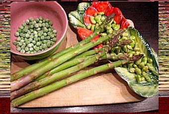 Préparez tous vos légumes , écossez les petits pois et les fèves (aux fèves vous enleverez la première peau ) . Epluchez vos asperges avec un économe , coupez-les en biais et rincez tous vos légumes .