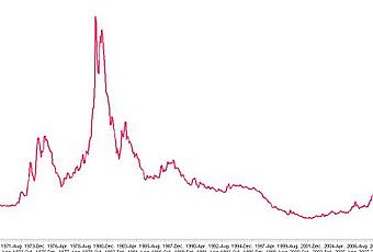 Voici le résultat du prix relatif (donc sans dimension, cf votre professeur de physique pour cette notion fondamentale) de l'or rapporté à la masse monétaire M3 US $ de 1968 à 2010 :