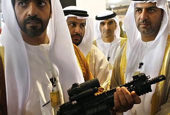 Vistez le salon militaire en Jordanie !Sur la photo , Cheikh Hamed Ben Zayed Al-Nahyane, la tęte de l'autorité d'investissement d'Abou Dhabi, tiennant une arme lors de l'ouverture du SOFEX, le salon de défense et des opérations des forces spéciales. Le salon se déroule du 10 au 13 mai Amman, capitale de la Jordanie .