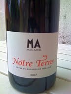 Cote du Roussillon, Mas Amiel Notre terre 2007 : Un nez discret marqué d'une pointe de volatile/vernis sur fond de fruit mûr, cerise, un fond cacao, des notes de noyau. La bouche est charnue, attaque ronde, belle structrure, fruit mûr, noyau, mais c'est assez fermé. La finale est large, marquée d'une pointe alcool, puissant, fruit mûr, kirch, noyau, chocolat. Bien 84 pour l'instant car fermé.Amicalement, Matthieu