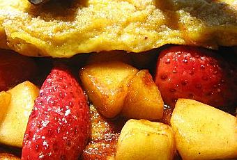 * Pour le dressage, déposez l'omelette dans une assiette. La garnir de fruits à moitié. Arrosez de sirop de réglisse et refermez celle -ci.