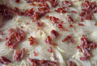 Couvrir chaque tarte de rondelles d'oignons puis de lardons allumettes (prévoir 300 g de lardons pour la totalité de la recette) et cuire à four chaud pendant environ 5 min dans le four à pizza électrique, sur thermostat 2,5 ou environ 15 min dans le four traditionnel (suivant les fours) Th. 250°C.