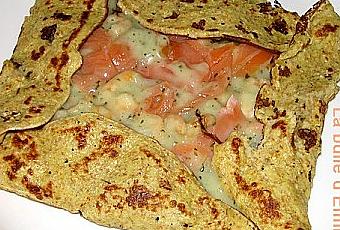 Préparer la pâte pour les galettes en mélangeant tous les ingrédients. En verser la moitié dans une poêle et faire cuire à feu moyen. Quand la galette est presque cuite, la retourner et la cuire sur l'autre face. Verser la moitié de la préparation aux crevettes et recouvrir avec une tranche de saumon émincée. Replier les bords de la galette et déguster !