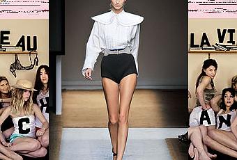 YSL habille sa femme d'un short en noir et d'une blouse blanche vaporeuse ceinturée à la taille. C'est canon!