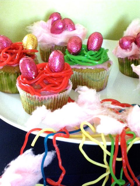 Faire des Cupcakes au thé vert (surtout pour la couleur) les décorer d'un glaçage rose bonbon, et après laisser libre court à votre imagination............oeufs en chocolat, bonbons rigolos....