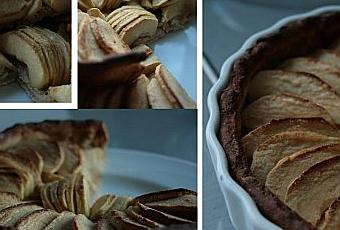 D'habitude, je ne dispose pas les pommes de cette manière, je les coupe en cubes et les "jette" directement sur le fond de tarte, en couche épaisse. C'est délicieux et pas trop sucré...