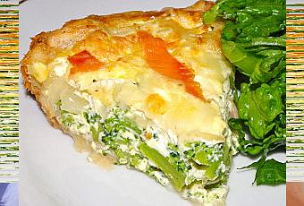 Déposer sur la pâte, le mélange brocolis-échalotes-saumon, la préparation oeufs-crème fraîche-gruyère et déposer sur le dessus les lamelles de saumon.