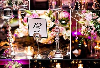 Les chandeliers et autres fioritures: tout en transparence. Il est bon d’apporter de la transparence et de la clarté a une decoration de mariage dans le genre. Les bougeoirs, les chandeliers, les vases certains objets transparents donneront de la luminosité a la decoration de la table. C’est le cas de certains accessoires deco en verre, cristal assortis de decors de diamants: jouez la carte de la seductions avec un mariage blin bling en noir et violet dont certains details seront clinquants avec du diamant!