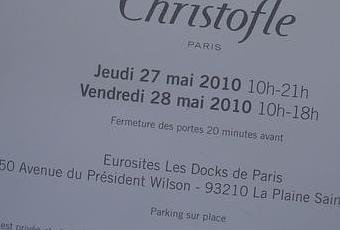 Deuxième salve fin mai avec la vente Christian Louboutin les 28 et 29 mai et le petit nouveau : Christofle qui réalise sa vente privée les 27 et 28 mai, aux Docks de Paris, à la Plaine St Denis, à partir de 10h. En complément de la gamme Christofle, il y aura aussi la marque D.Porthault, spécialisé dans le linge de maison haut de gamme, et la marque Point à la Ligne.