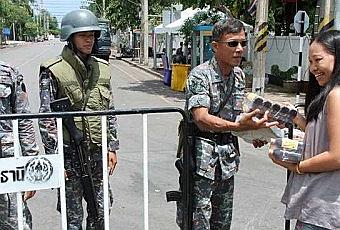 Les militaires sont toujours en place aux endroits stratégiques depuis 48h00. Ancien militaire de carrière nous avons décidé, avec mon épouse, d’apporter des boissons à ces militaires qui protègent les institutions de la nation Thaïlandaise.