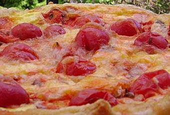 Durant la pré-cuisson de la pâte, battez les œufs en omelette ajoutez le lait un peut de sel et de poivre (au goût) versez sur la pâte ensuite déposez les tomates cerise parsemez de feuilles de thym et de mozzarella râpée