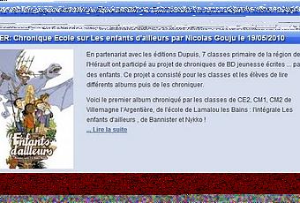 Partenaire depuis le début, le site BDaBD met en ligne depuis hier des chroniques faites par des élèves des écoles de l'Hérault dans le cadre de la fête de la BD d'Hérépian. Je remercie au passage toute l'équipe du site qui sera d'ailleurs présente le 12 juin et les éditions Dupuis qui ont joué le jeu en envoyant aux différentes écoles des séries d'albums. A titre personnel, je peux dire que dans ma classe, les enfants prennent beaucoup de plaisir à lire ces BD et surtout à en discuter.