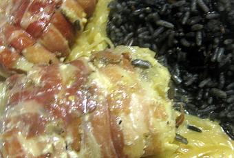 Pendant ce temps former des petits ballotins de lotte avec le lard, les faire tenir avec de la ficelle. Une fois les petits ballotins formés les mettre dans la poêle, les faire revenir 6 min puis déglacer avec le vin blanc.